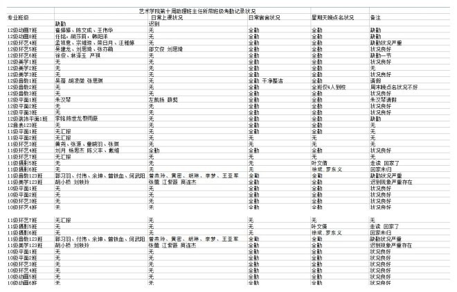 艺术学院第十周助理班主任所带班级考勤记录情况