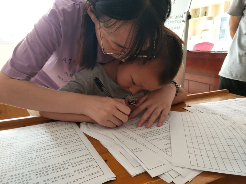图为志愿者教写字