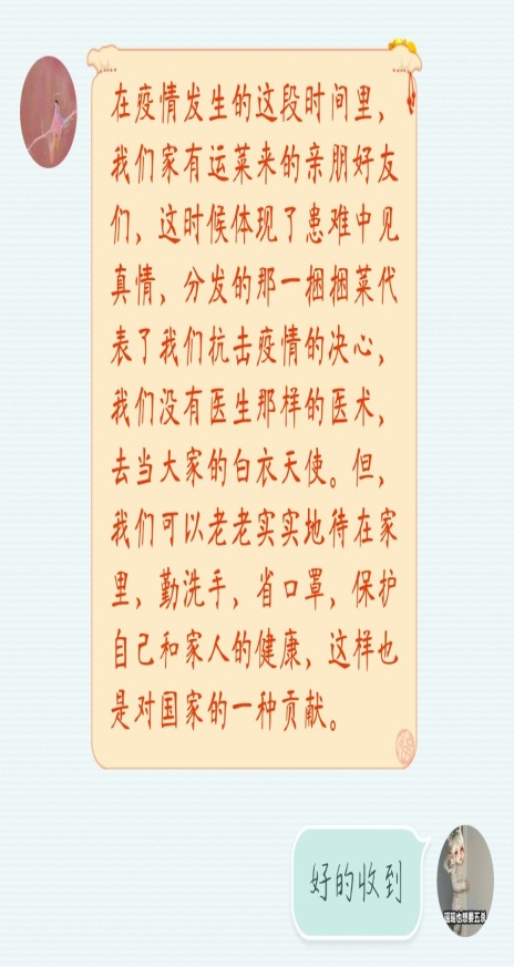 活动中,同学们在班群里积极发表自己对疫情期间的感想,分享疫情的小习惯,提供自我防护的小知识,团支书深刻总结同学们的发言,且分享一线抗疫人员的英雄事迹、激发大家的爱国情怀、与祖国共患难,做有担当的共青团员,其次同学们纷纷晒出为疫情做的贡献(绘画的作品、捐款、当志愿者等),最后金波院长带领我们为疫情设计的纪念章,展现艺术学院学子风采。