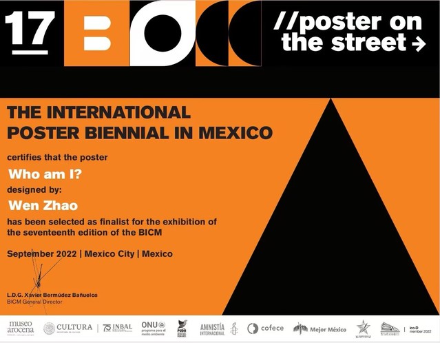 本网讯(通讯员蒋芳)据中国各大媒体信息,第17届墨西哥国际海报双年展入选作品名单公布,我院副院长赵文副教授设计的海报作品《我是谁?》成功入选,并于近日在墨西哥美术馆展出。