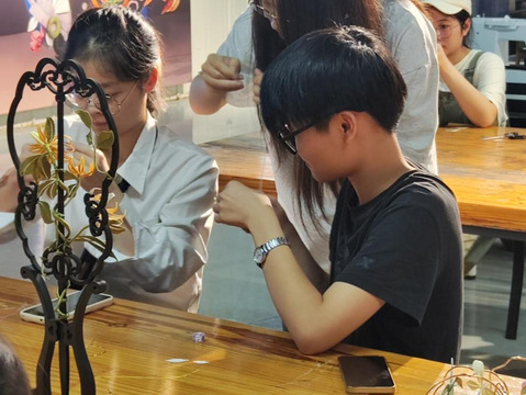 此次美育实践课上,同学们在老师和助教的带领下,学习非遗缠花知识,积极动手实践,开展交流互动,都一个个完成了自己的缠花作品。