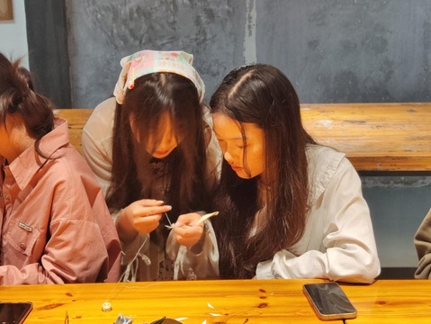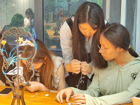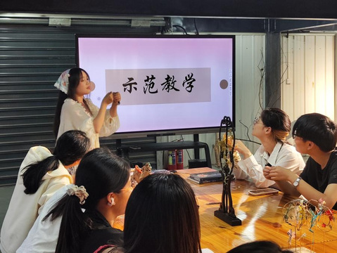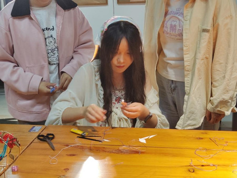 图为谢静副教授及团队成员杨丹、苏熠、王婷耐心向同学们示范缠花细节并纠错。同学们认真听讲,学习新知识,并在亲手制作中感受了非遗之美,在传承非遗文化的同时,“解锁”了新技能。