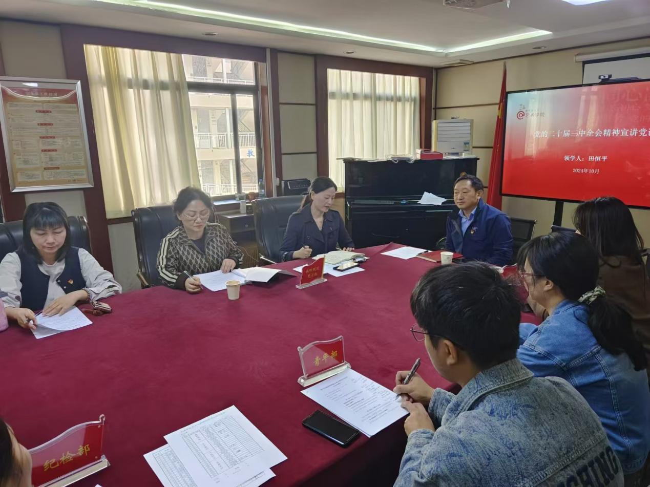 党委常委、副校长田恒平在会上高度赞扬了本支部在音乐学、舞蹈学师范认证中做出的努力与贡献,并获得了喜人的成绩,希望支部所有党员继续团结一心,在做好支部建设的同时,为硕士点的申报共同奋斗。田校长还为支部全体党员讲授党课,带领大家深入学习党的二十届三中全会精神,使大家进一步理解了深化教育改革的迫切需求、明确了下一步努力方向,他要求大家要立足岗位充分把握教育的政治属性,持续做好立德树人工作,为党育人、为国育才;要把握教育的人民属性,要不断提高人才培养质量、办好人民满意的教育。要把握教育的战略属性,主动融入、服务地方经济社会发展,为民族复兴伟业添砖加瓦。