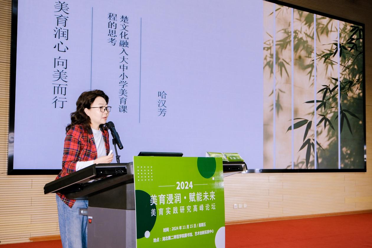 (通讯员 吴科)2024年11月 15日,2024·“美育浸润·赋能未来”美育实践研究高峰论坛在湖北第二师范学院图书馆二号报告厅、艺术创新实践中心举行。湖北省特级教师,全国中小学美育教学指导专业委员会委员、湖北省美育研究会常务理事哈汉芳老师做主旨发言:美育润心 向美而行——楚文化融入大中小学美育课程的思考。